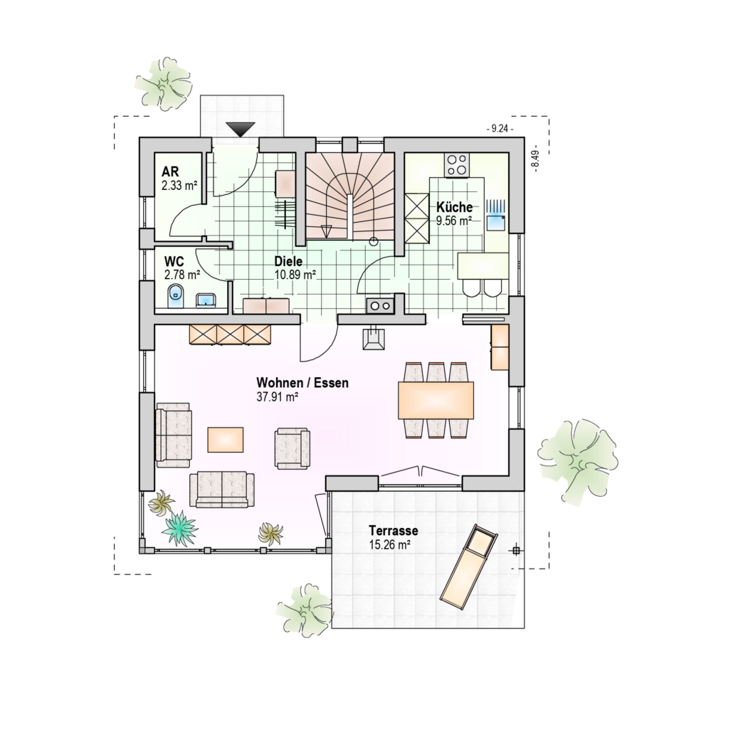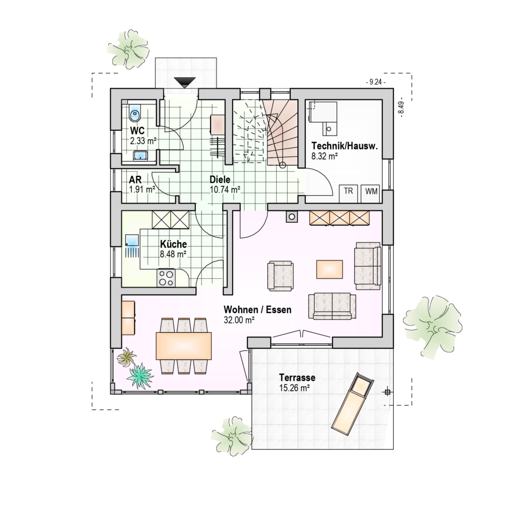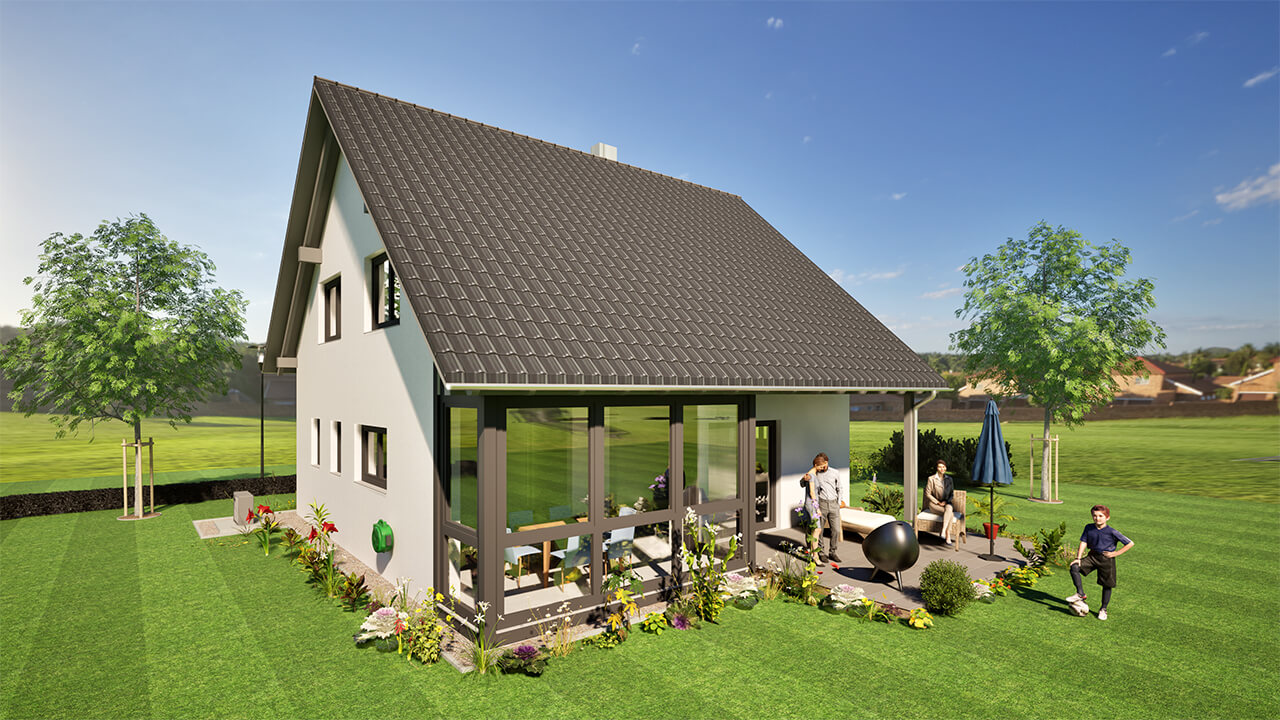 0 bzw. 75 cm Kniestock, 42° Satteldach, integrierter Wintergarten, überdachte Terrasse