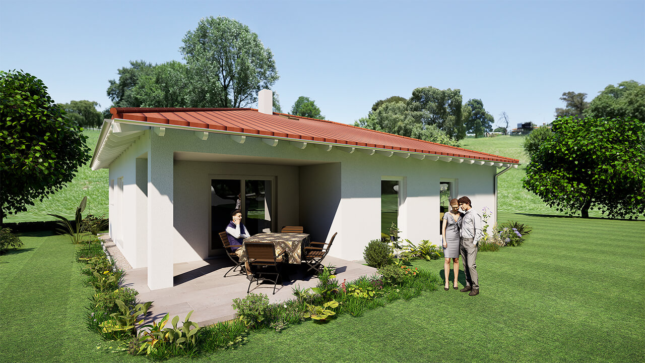 | Besonderheiten | Bungalow, Überdachte Terrasse, 18°- bzw. 22°-Walmdach |
