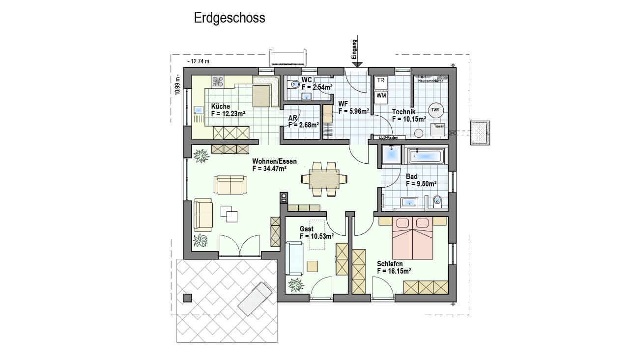 Alles auf einer Ebene und mit einer überdachten Terrasse kann man unser Haus Paul vom ersten Augenblick an genießen. Dabei wurde neben dem großzügigen Schlafzimmer auch an ein Gästezimmer und einen geräumigen Hauswirtschaftsraum gedacht.