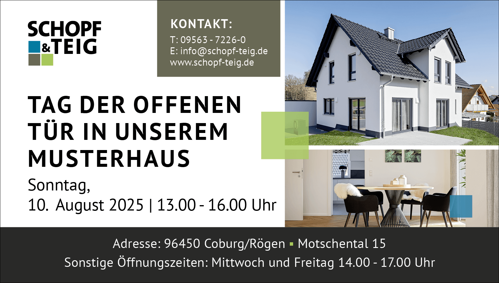 Am 10. August 2025 von 13:00 bis 16:00 Uhr öffnen wir für Sie die Türen zu unseren Musterhaus in Coburg / Rögen.